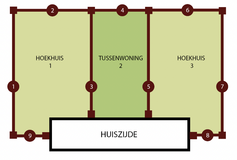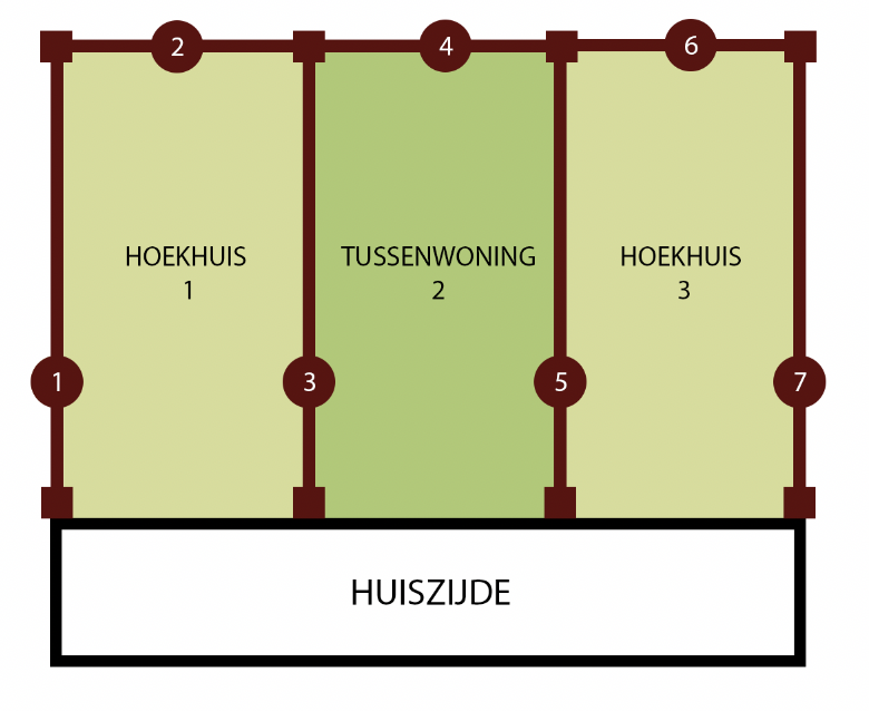 Situatie 2: Tuinen van de hoekwoningen breder dan de woning